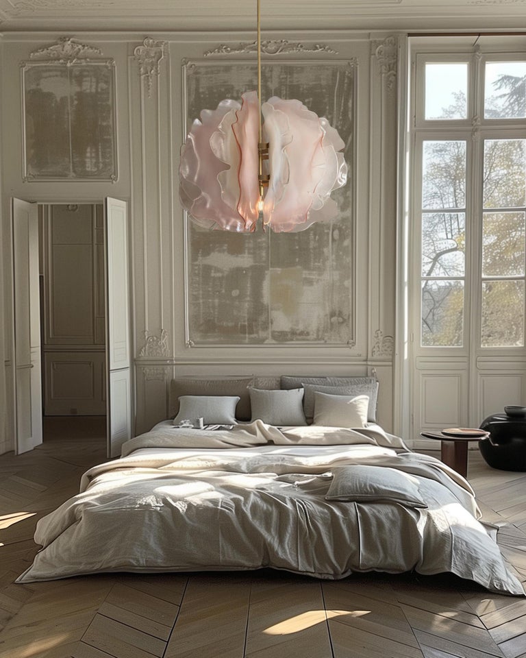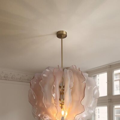 The Bloom Chandelier made up of 16 pink and white glass petals, each one of them hand-shaped.