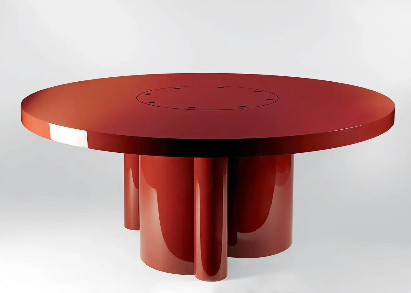This sculptural base supports the eight centimeter thick tabletop with an embedded revolving platter, or Lazy Susan in its center – ideal for an amiable dinner or discussion with up to ten people.