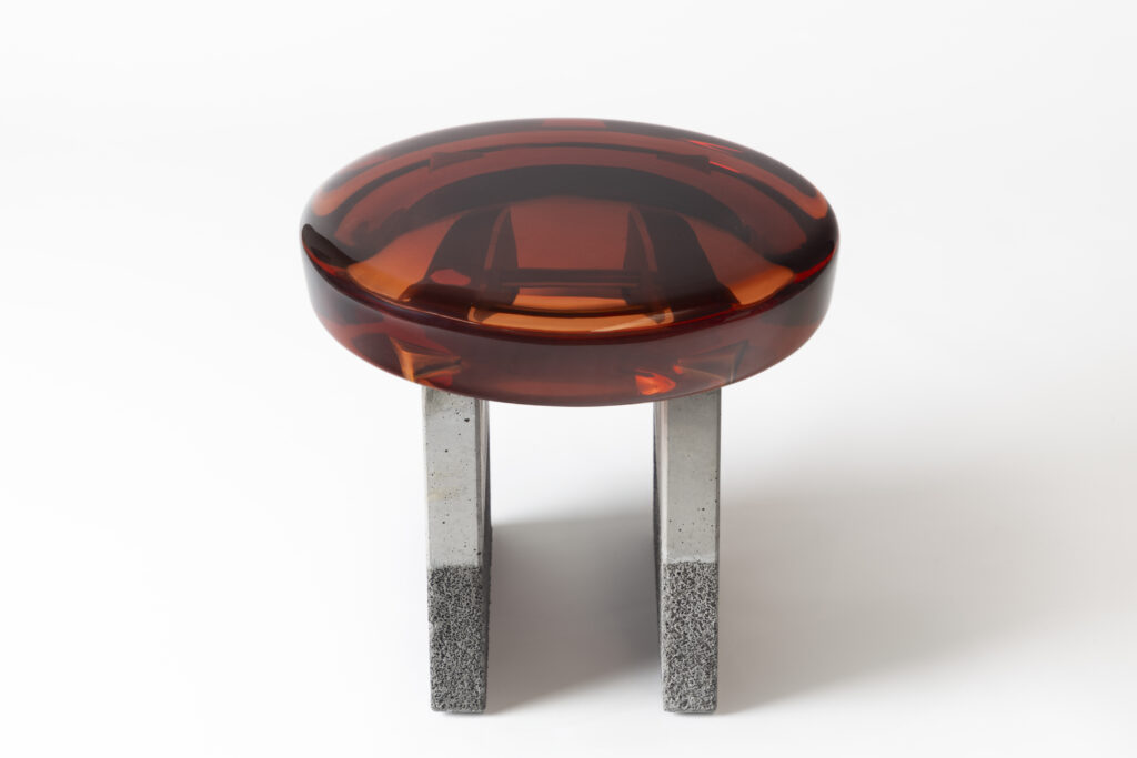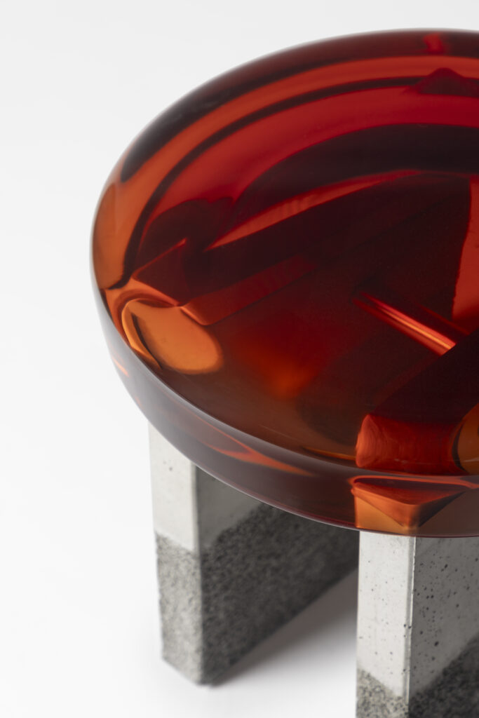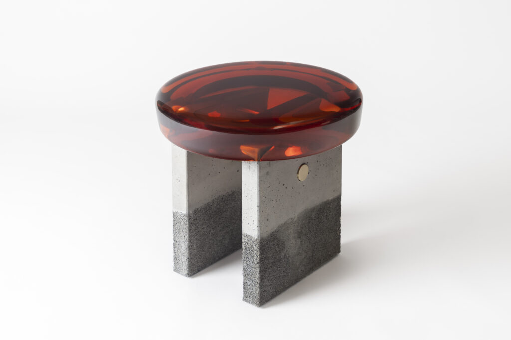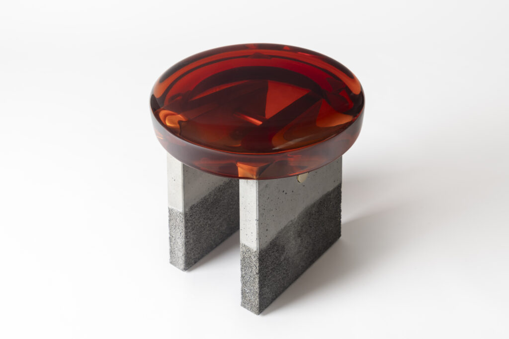 Formed from a combination of reflective resin and solid brass, the Jade coffee tables look like precious gems. The surface is made by hand in resin of 10 cm high: each one takes over a week to cast. Thanks to a handcrafted surface treatment, special brass veins characterize the structure of the coffee tables. Inspired by the magical mineral color palette of Transparency matters, these coffee tables are featured by ethereal transparency, luxurious sensitivity, and a reflective surface that plays poetically with the light, reflecting your gaze as a functional work of art.