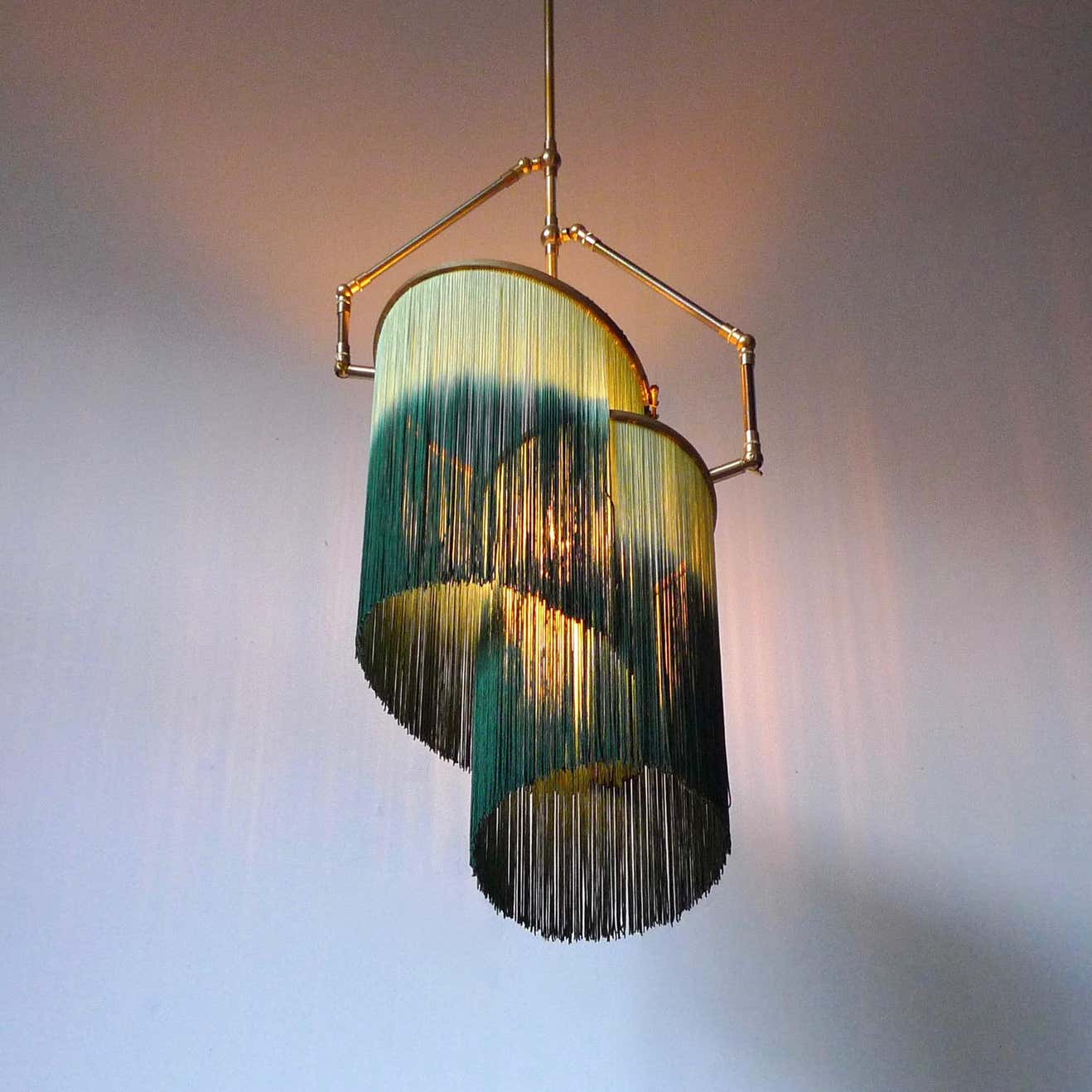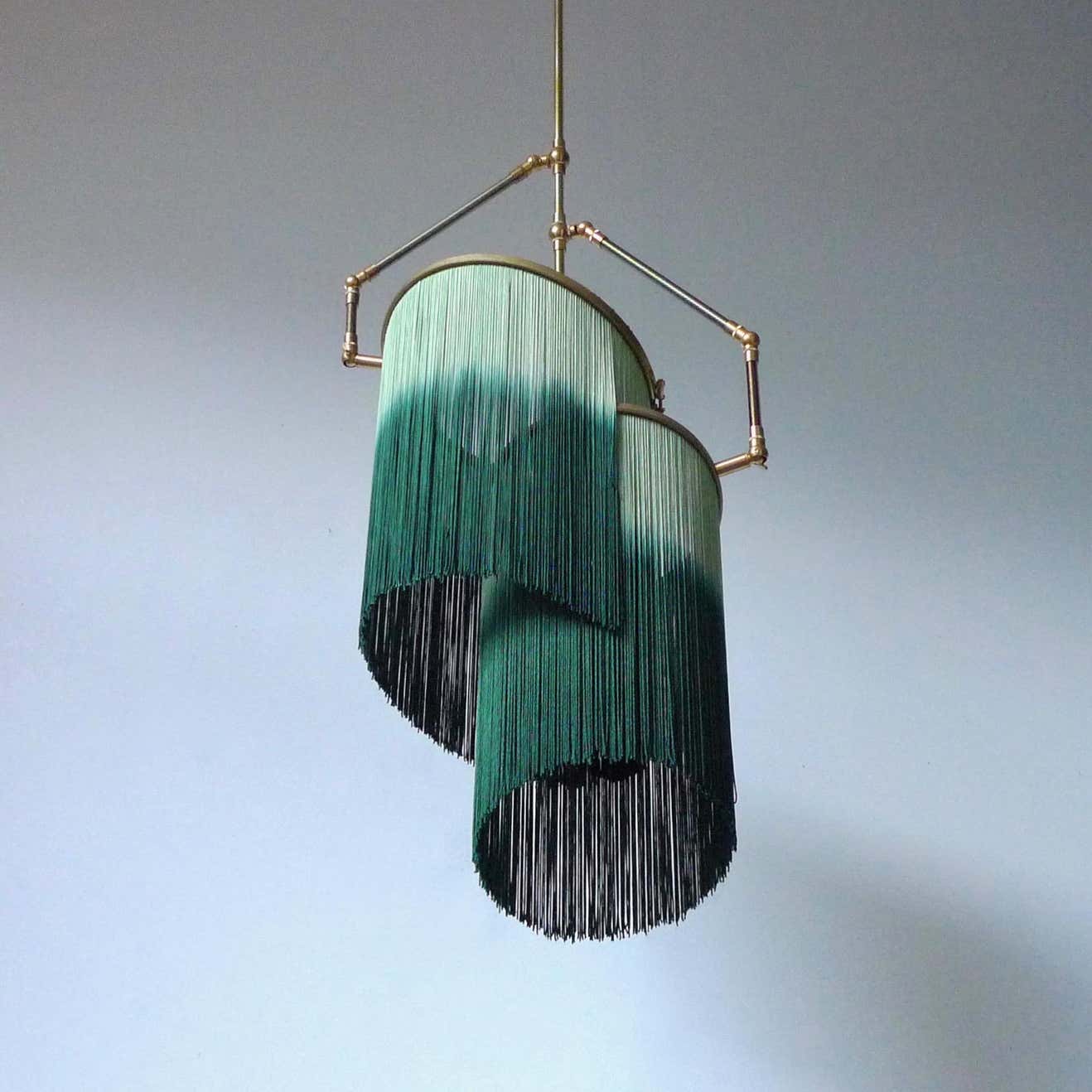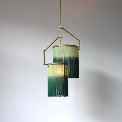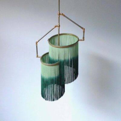 Hand-sculpted in brass, leather, wood and dip dyed colored Fringes in viscose.