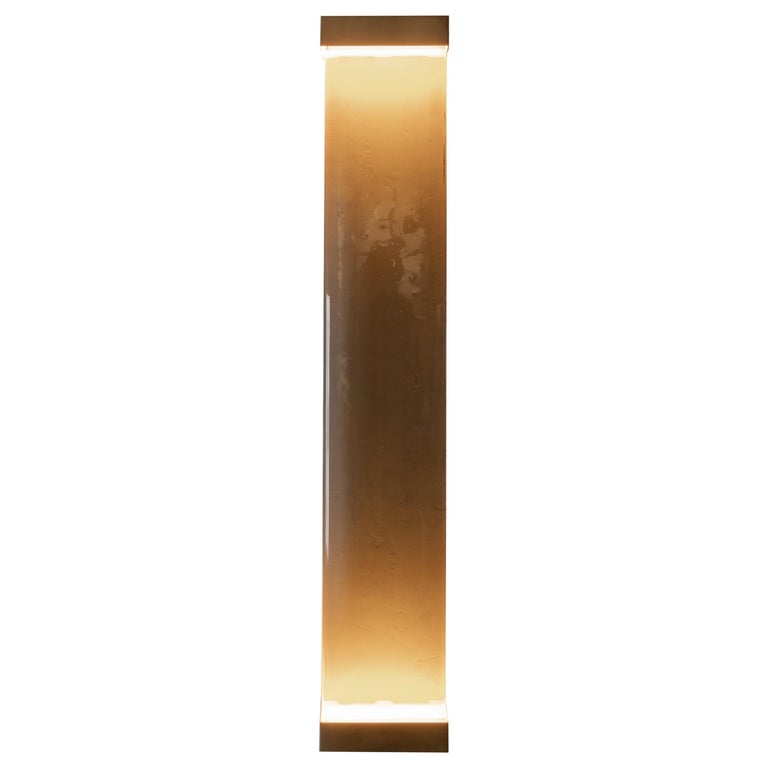 Inspired by minimalism, the Jud lamps are an homage to the artist Donald Judd. Made in translucent glass, different tones have been fused together to reflect a harmonious colour palette. The item is composed by a brass structure, a melted glass plate, a led lighting and a light filter in colored resin. Available in a wide range of vibrant colour variations. Handcrafted in Draga & Aurel atelier in Como, each piece is unique.