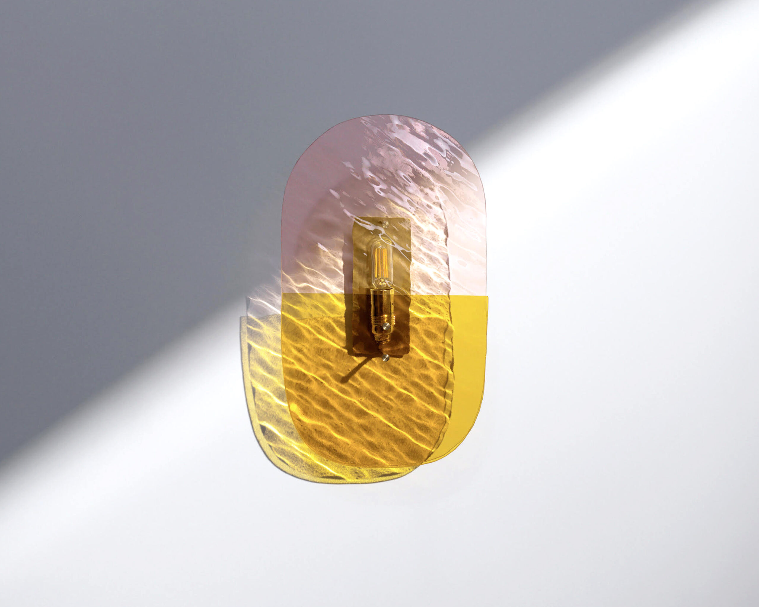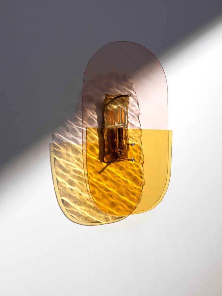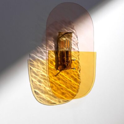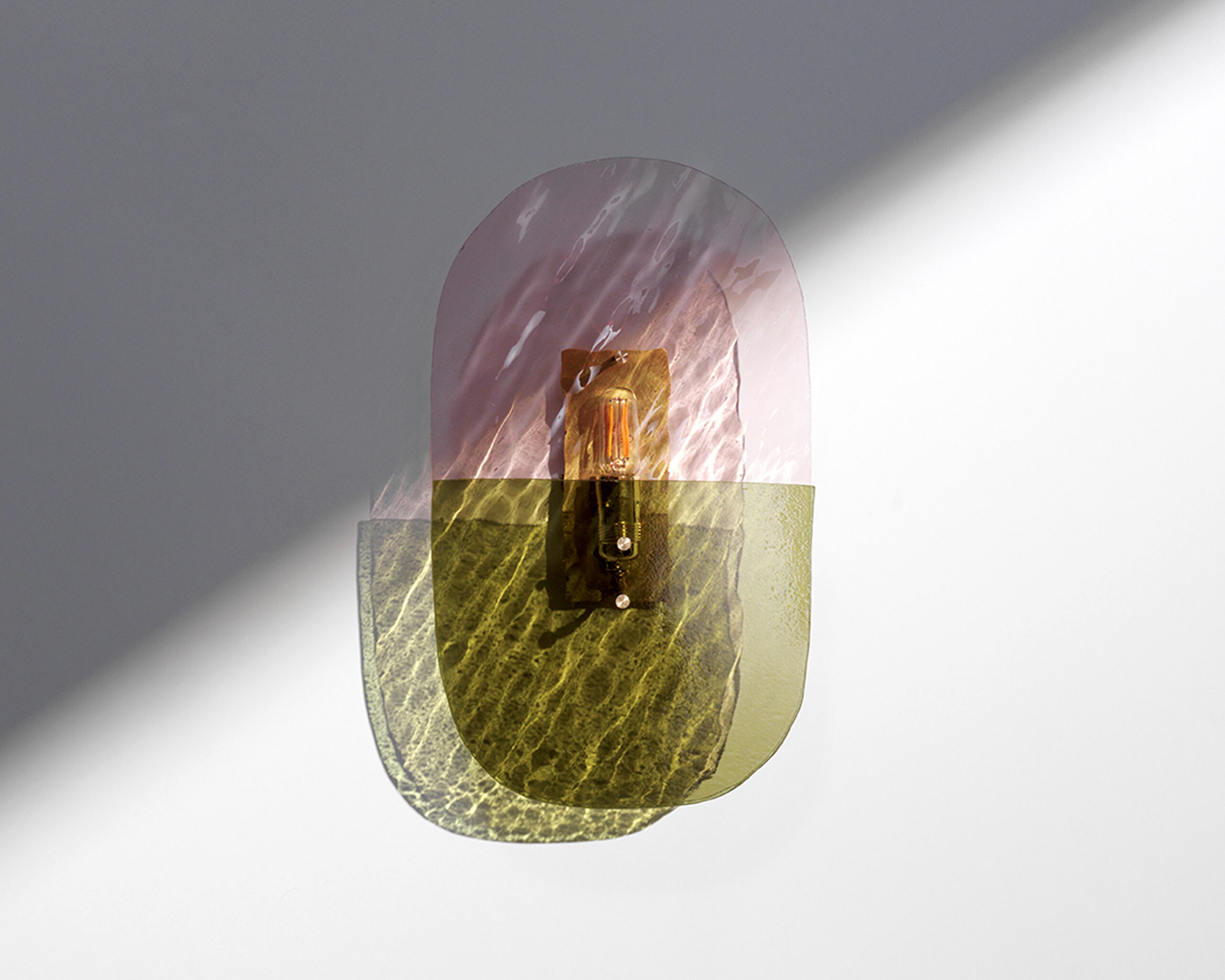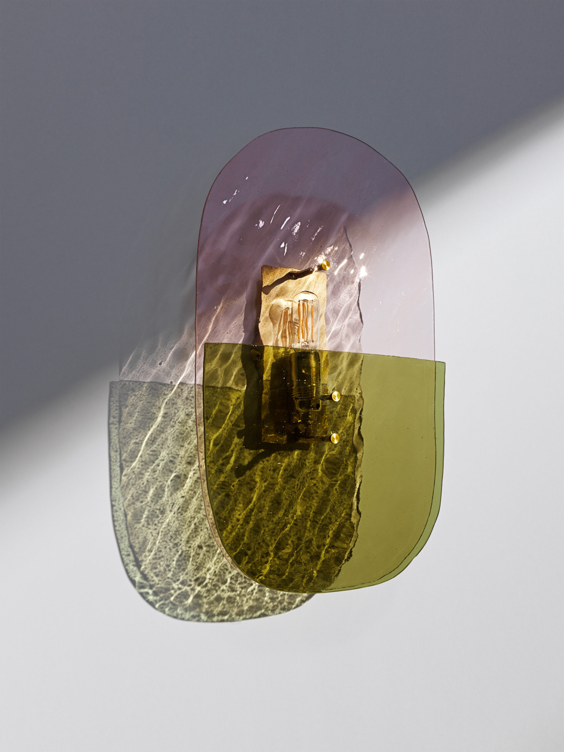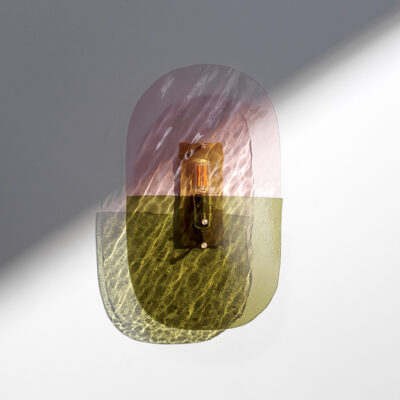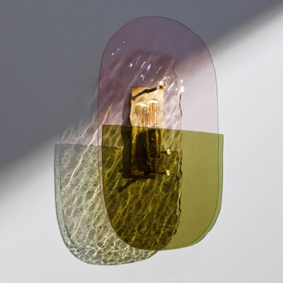 Materials: Champagne pink wave glass sheet, smooth olive green glass sheet, brushed brass structure and finish