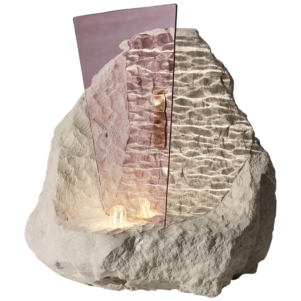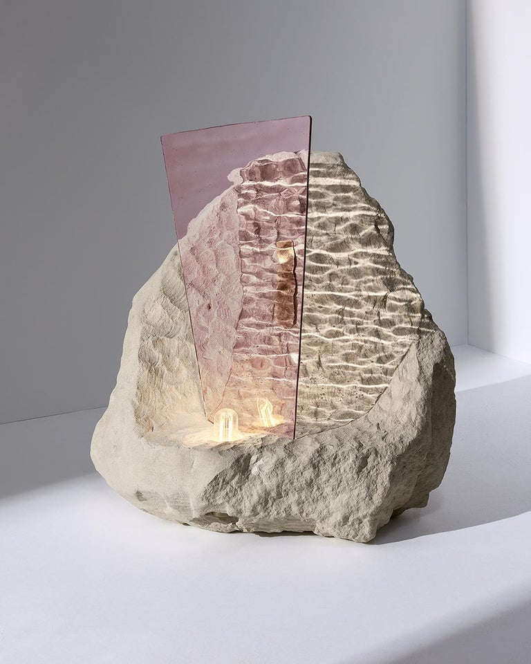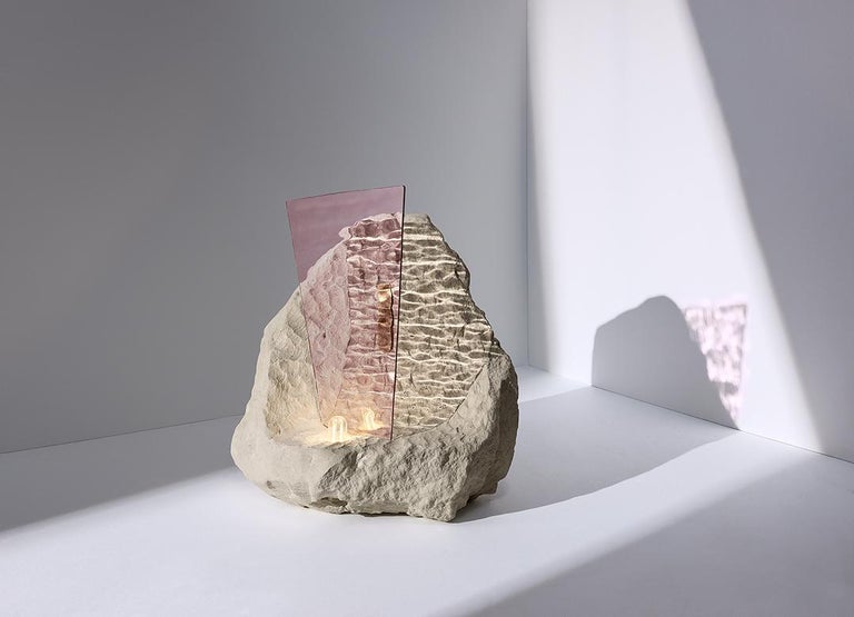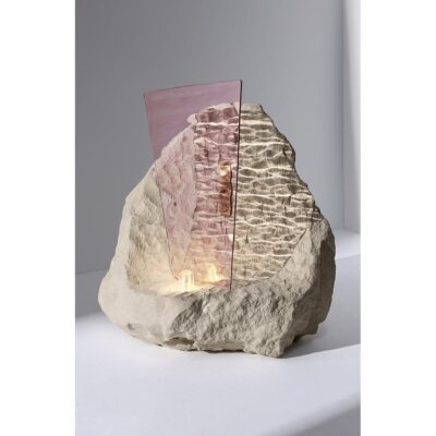 Materials: Translucent wavy rose glass, Tufa stone and brass finishes