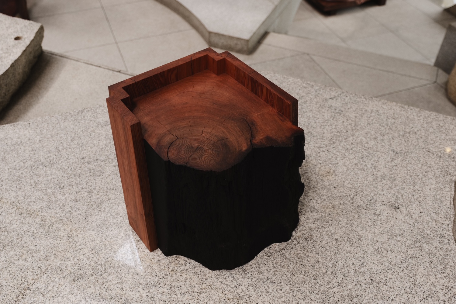 Working with salvaged and locally sourced wood, Yoshimoto creates both sculptural and functional pieces that respond directly to the inherent qualities of each material. His process is intuitive and material-led, shaped by close observation and gradual intervention, allowing the grain, scars, and irregularities of the wood to guide the final form. Through a balance of precise geometric cuts and organic expression, his work reveals the tension between control and natural growth.